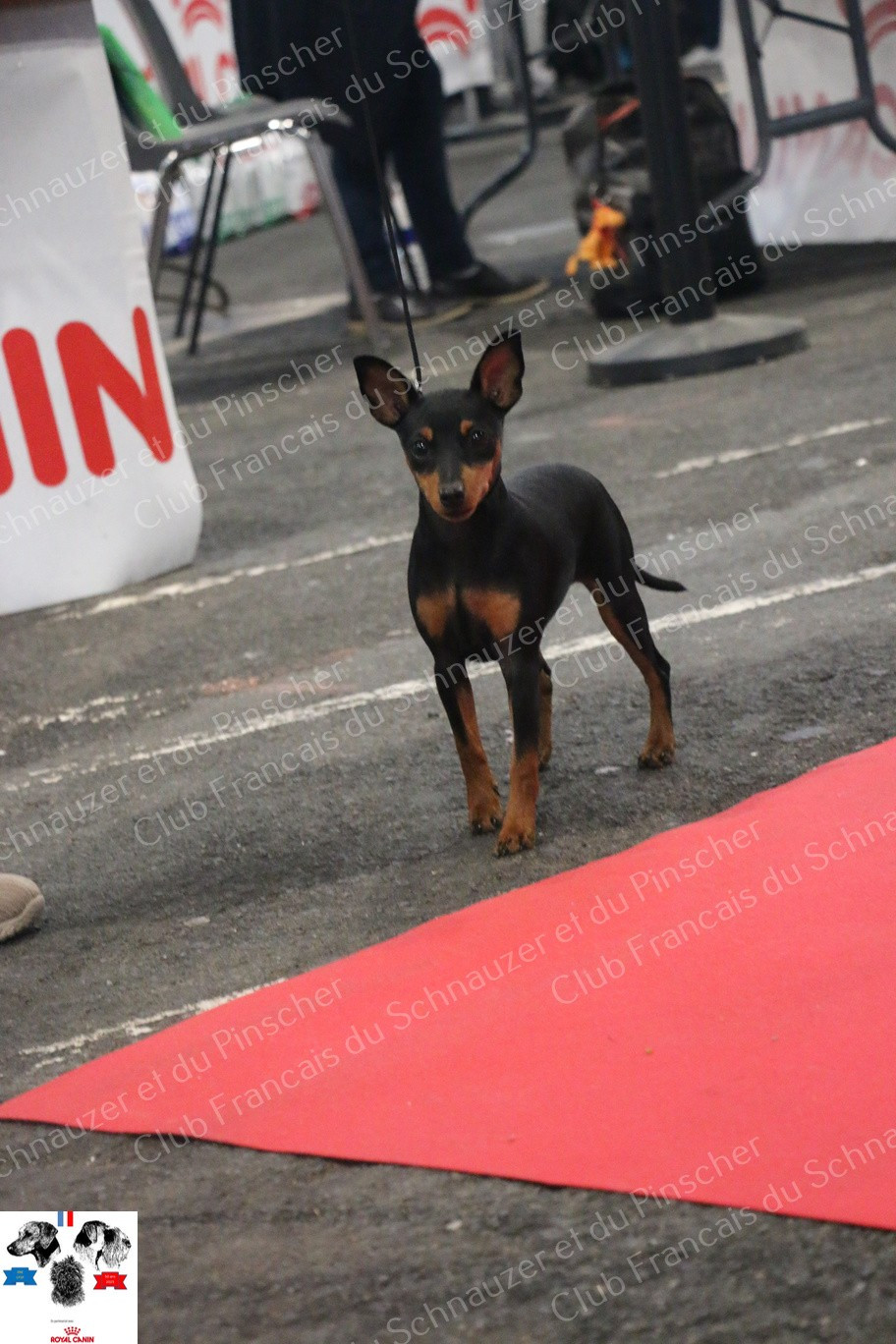 Feminine, puissante, excellente ossature, excelent angulation Avant / Arrière. Bon dos et poitrine, belle encolure, jolie tète lignes parallèles, excellent yeux foncé, bon menton, DCC. Aux allures pli un peu les coudes